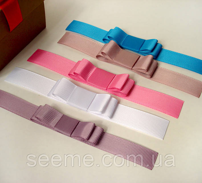 Бант репсовий, розмір 60 мм. З репсової стрічки завширшки 20 мм. Бант прикріплений до стрічки 150 мм. Підходить для прикрашання кришки коробки 70х70 мм; 90х55 мм; 55х170 мм. На краях стрічки прикріплений двосторонній скотч.